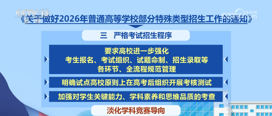 對(duì)于2026年普通高校部分特殊類型招生工作,《通知》要求,各地各有關(guān)高校建立有效監(jiān)督機(jī)制,暢通社會(huì)監(jiān)督渠道,及時(shí)公開(kāi)公示有關(guān)信息,主動(dòng)接受監(jiān)督。未按要求公示的考生一律不得錄取,牢牢守住公平公正底線。
